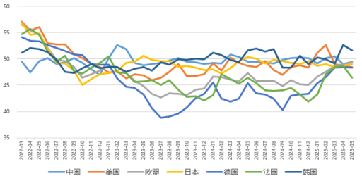 5月,全球制造業(yè)指數(shù)微幅上升,全球經(jīng)濟(jì)低位徘徊。除韓國(guó)外,中國(guó)、美國(guó)、日本及德國(guó)、法國(guó)為代表的歐盟均處于榮枯平衡線之下。關(guān)稅對(duì)全球經(jīng)濟(jì)的擾動(dòng)仍然存在,導(dǎo)致全球經(jīng)濟(jì)恢復(fù)的不確定性增加。