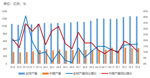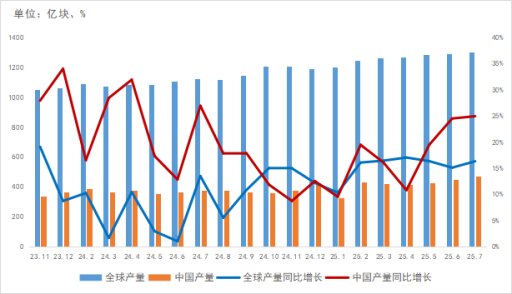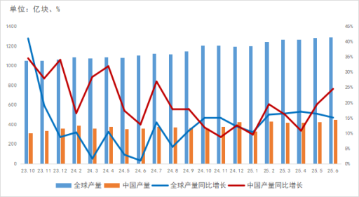 從集成電路產(chǎn)量看,9月全球及中國(guó)集成電路產(chǎn)量分別為1313億塊、437.1億塊,增長(zhǎng)穩(wěn)定。