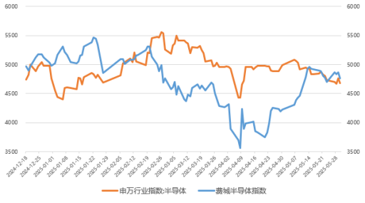 從資本市場(chǎng)指數(shù)來看,5月費(fèi)城半導(dǎo)體指數(shù)(SOX)上升10.4%,中國(guó)半導(dǎo)體(SW)行業(yè)指數(shù)下降7.9%,國(guó)內(nèi)半導(dǎo)體資本市場(chǎng)受關(guān)稅沖擊明顯。