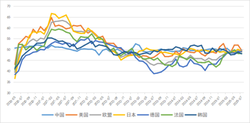 6月,全球制造業(yè)有所改善,經(jīng)濟(jì)運(yùn)行基本面穩(wěn)中向好,但各國(guó)通脹分化加劇。除美國(guó)、日本外,中國(guó)、韓國(guó)及德國(guó)、法國(guó)為代表的歐盟均處于榮枯平衡線之下,各經(jīng)濟(jì)體之間在通脹趨勢(shì)上存在顯著差異。其中,得益于中美貿(mào)易關(guān)系的正常化以及7月9日關(guān)稅暫停到期前的企業(yè)提前備貨行為,全球制造業(yè)活動(dòng)有所改善。