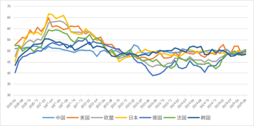 10月,全球制造業(yè)PMI波動(dòng)持續(xù),各國(guó)/地區(qū)經(jīng)濟(jì)表現(xiàn)呈現(xiàn)出顯著分化。除美國(guó),中國(guó)、法國(guó)、韓國(guó)及日本均有所下跌。其中,歐盟地區(qū)經(jīng)歷超三年的持續(xù)收縮后止跌企穩(wěn),但未能實(shí)現(xiàn)增長(zhǎng),需求增長(zhǎng)乏力。